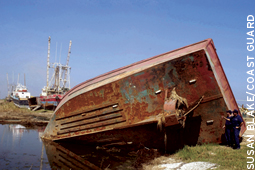 Artist Joey Blazek depicts the transfer of a harbor pilot off Texas.