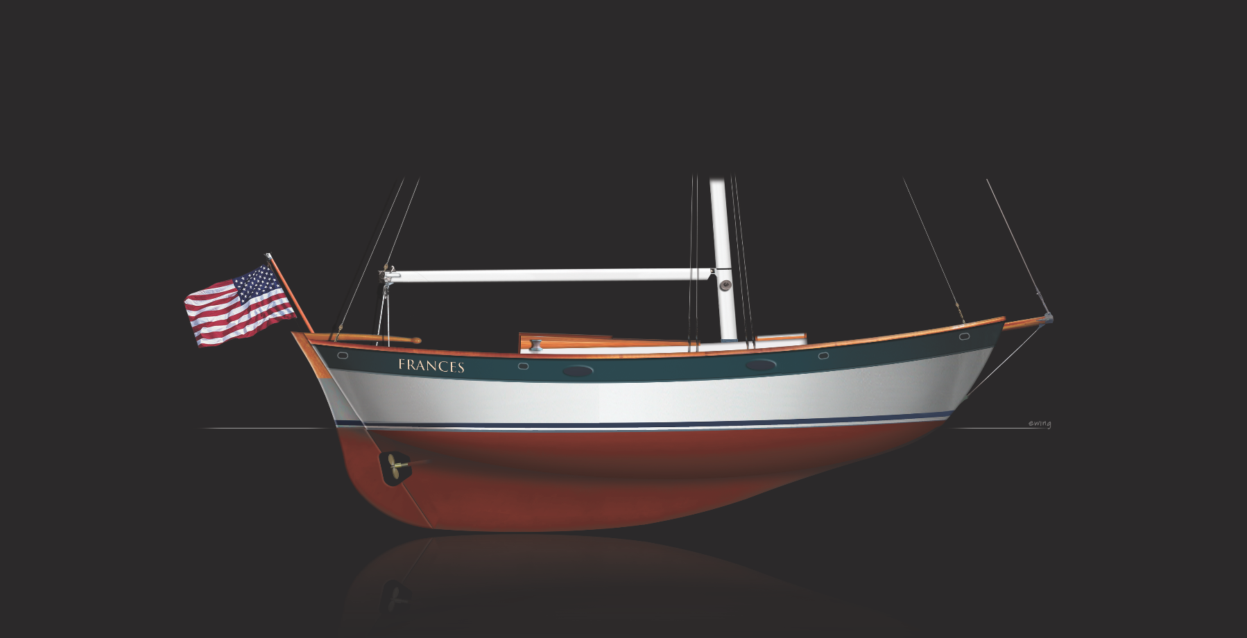 First built in 1975 by Chuck Paine to his own design, the Frances 26 is a small, shoal draft double-ended boat with rounded bilges and a transom-attached rudder.