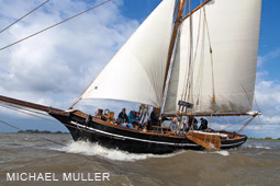 Slowly the black-hulled vessel backs into her berth. A lively cross breeze turns this process into a balancing act, especially for the skipper, who has