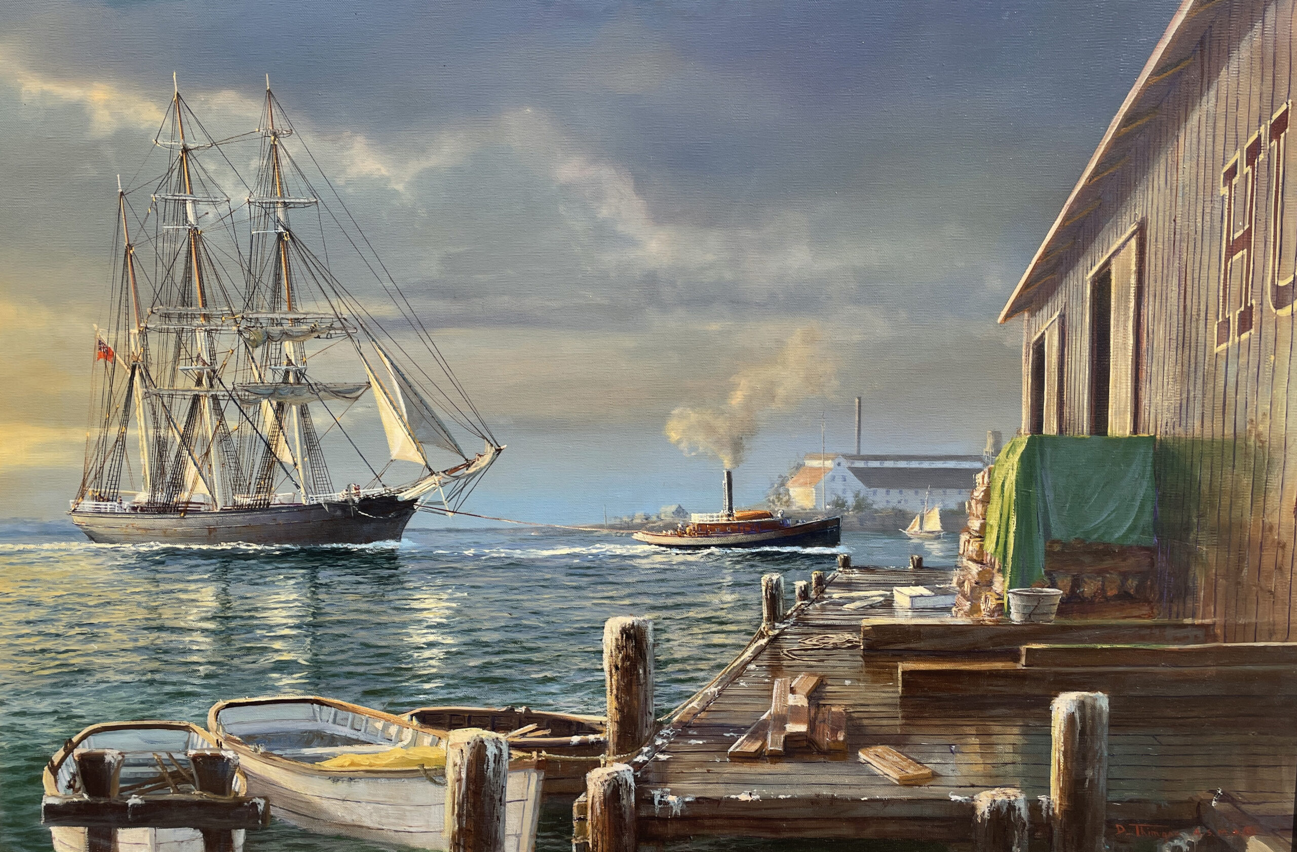 In the painting “Sea Trade” by David Thimgan, the clippership Woolahra is being towed into Humboldt Bay by the steam tug Ranger.