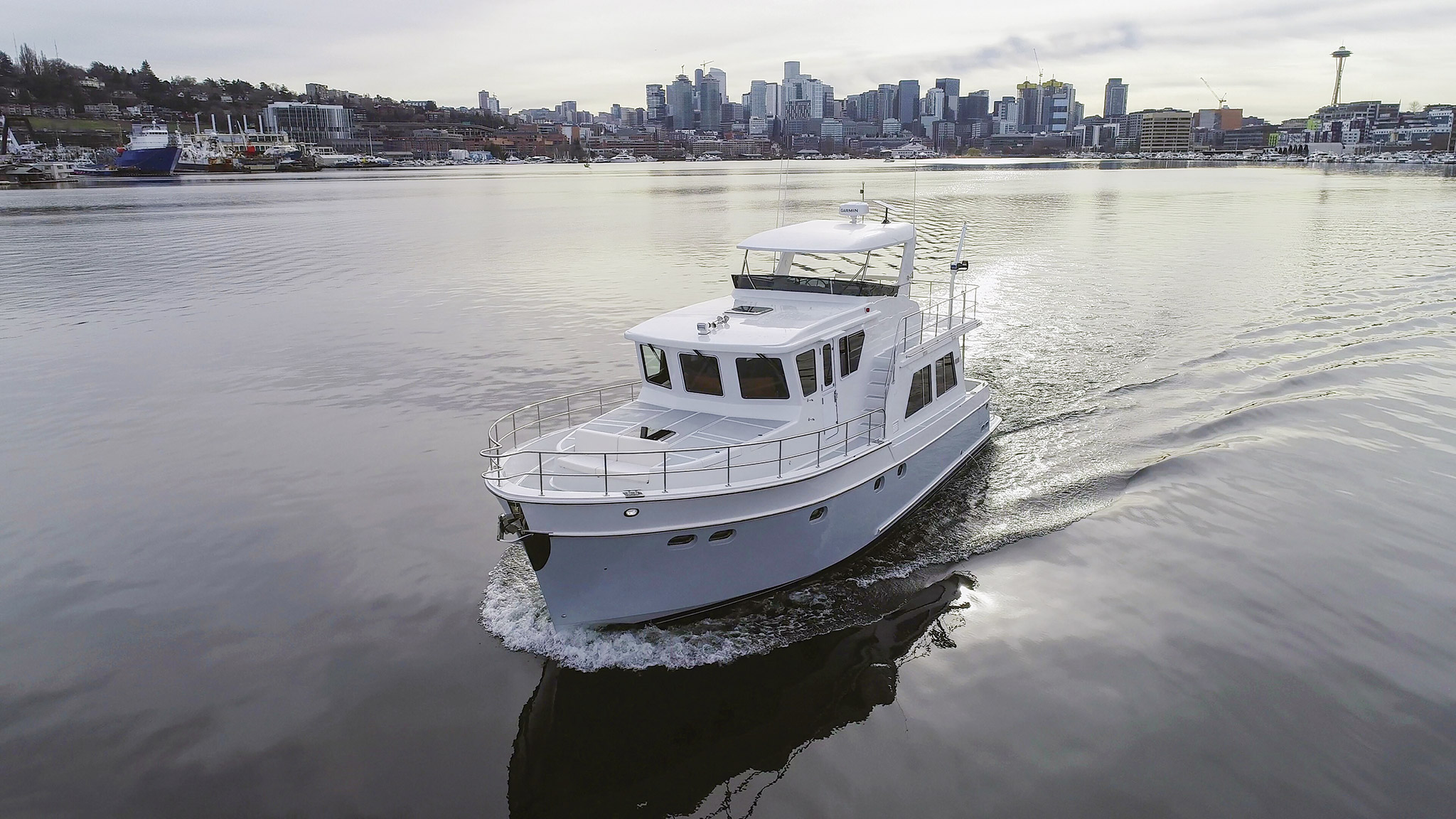 This brawny expedition vessel is a worthy flaghship for a West Coast-based builder of trawler yachts.