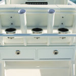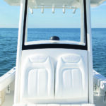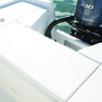 In addition to the forward-facing lounges in the bow, the 24XO has a two-person bench forward of the console, with an insulated cooler compartment underneath; a two-person leaning post at the helm; and a two-person, fold-up bench at the transom, which converts to an aft casting platform. The platform conceals a 102-quart live well on the starboard side and dry stowage to port that can be plumbed as a live well.