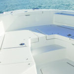 The forward casting platform comfortably accommodates two anglers, and the stowage compartments beneath it can be used as additional fishboxes or as lockable rod stowage. With the cushions in place, the casting platform provides a pair of forward-facing lounges with flip-up backrests. A dedicated 189-quart insulated fishbox with macerated drain is beneath the forward deck.