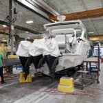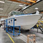 The 430 and 400 SSC’s triple command seating has been smartly transferred to the 380, offering chiseled support and advanced ergonomics. Each seat bottom adjusts for options to stand directly on the cockpit sole, or to sit or rest on the upright seat, while two footrest heights further customize the fit. The sturdy composite dash features a Liquid Black floating panel showcasing a Raymarine Axiom 12 GPS widescreen color chartplotter with upgrades to dual Axiom 12’s or XL 16’s. The 380 SSC also features Mercury® DTS with SmartCraft Vessel-View™, intuitive waterproof rocker switches, and digital switching with chartplotter control and blue LED accent lighting. A lockable dash storage compartment with floating Liquid Black front safeguards your valuables while a padded mobile device station with dual USB charging port and wireless charging conveniently displays your screens. Take your choice of horsepower or powertrain – twin 430 HP MerCruiser® 8.2 MAG HOs or Mercury Racing® 520 sterndrives, triple Mercury 350 or 400 Verado, Mercury Racing 400R or 450R outboards respond instantly to your control with electronic shift and throttle, Mercury® Joystick Piloting w/Active Trim and impressive leather-wrapped, polished stainless tilt steering wheel.