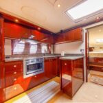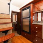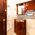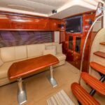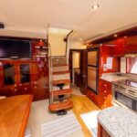 That was certainly in evidence in 2008 with the introduction of the 48 Sundancer, a remarkably handsome hardtop cruiser whose sweeping lines and distinctive hullside ports reset the styling standard for boats in her class. Built on a beamy deep-V hull with a solid fiberglass bottom and prop pockets to reduce shaft angles, the opulent two-stateroom interior of the 48 Sundancer is a sophisticated blend of high-gloss cherry cabinets, Ultraleather seating, hardwood floors and designer galley appliances. Both staterooms are private, and the forward head is split with the toilet and sink to port and the shower to starboard. A 26′ flat-screen TV/ DVD is standard in the salon, and the aft head has a separate stall shower.